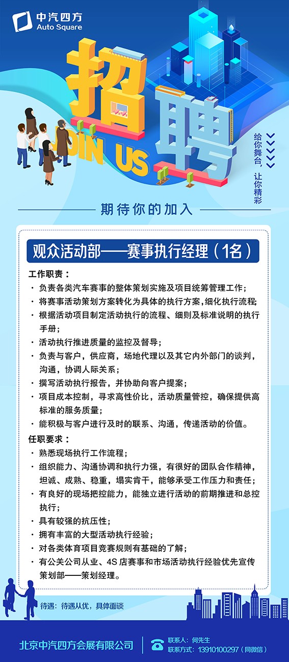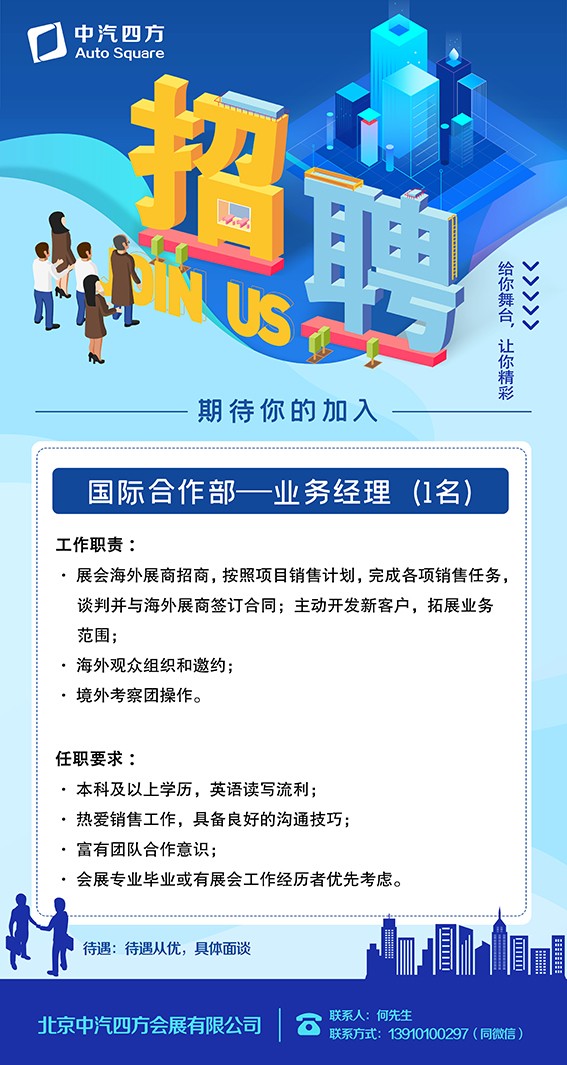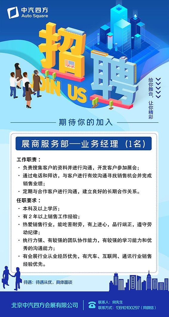 春節(jié)過(guò)完,我們正式踏入充滿(mǎn)希望的2023年。有人用重啟、回歸、復(fù)蘇,來(lái)形容對(duì)這一年的期待,中汽四方作為一家專(zhuān)注國(guó)內(nèi)外會(huì)議及展覽服務(wù)、傳媒廣告業(yè)、國(guó)際技術(shù)合作和進(jìn)出口貿(mào)易、咨詢(xún)服務(wù)的會(huì)展服務(wù)公司,已經(jīng)迫不及待想要去記錄行業(yè)故事和變革。歡迎有好奇心、樂(lè)于思考、踏實(shí)靠譜的小伙伴加入我們。