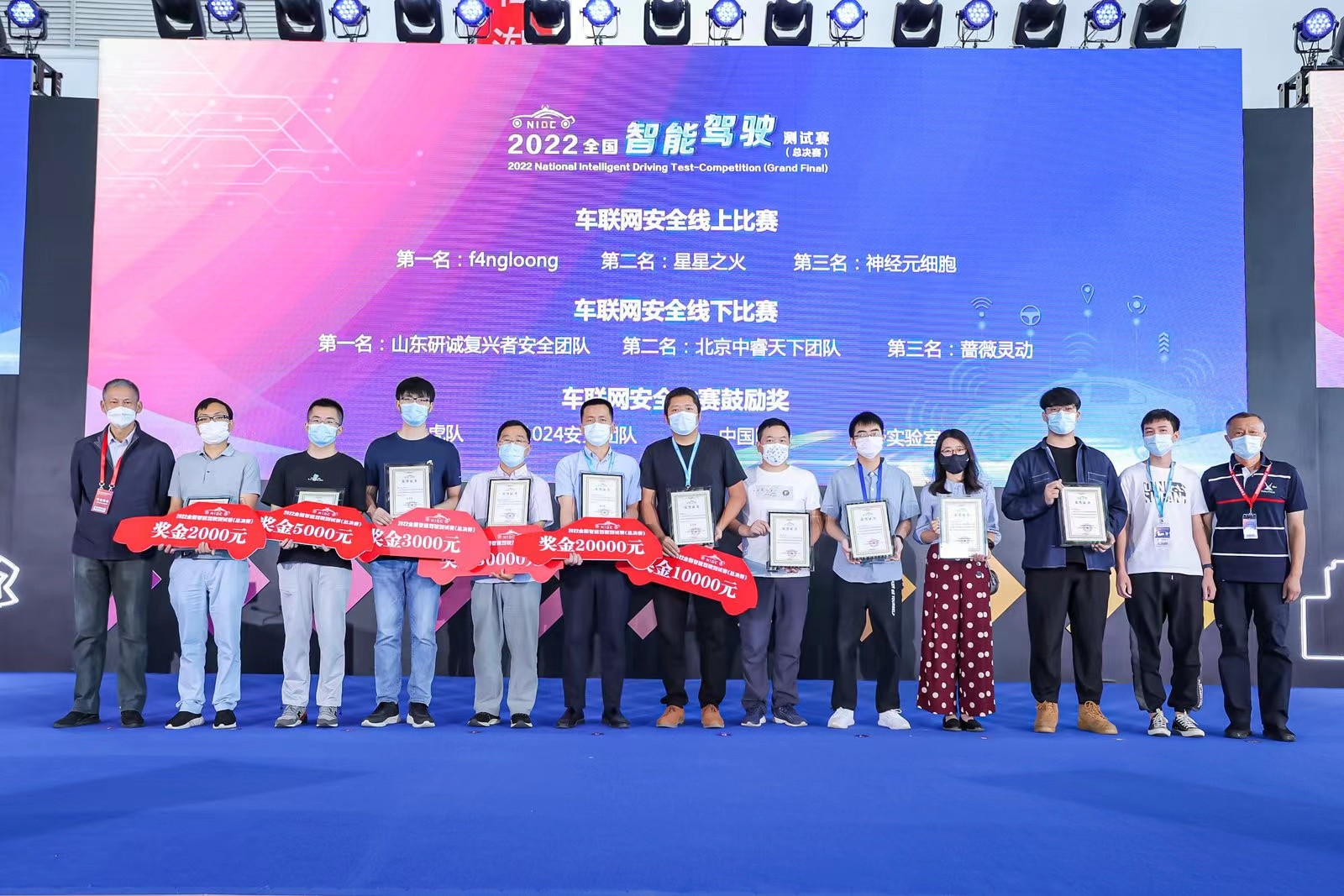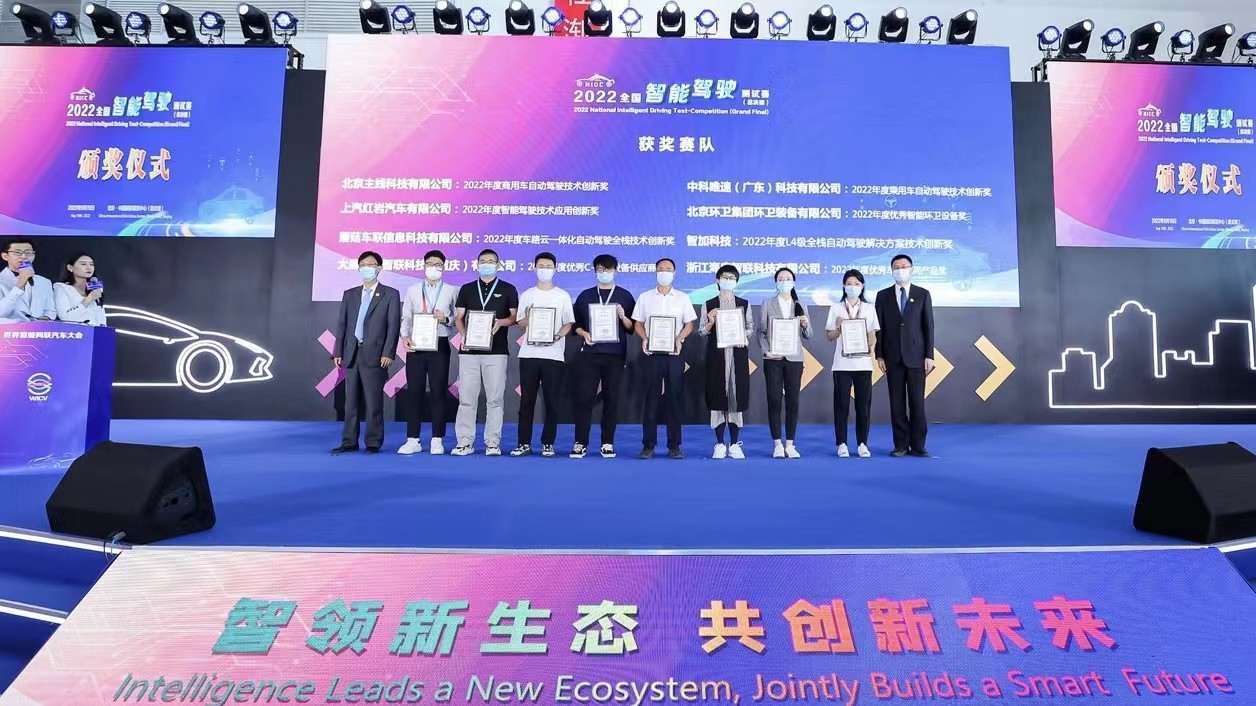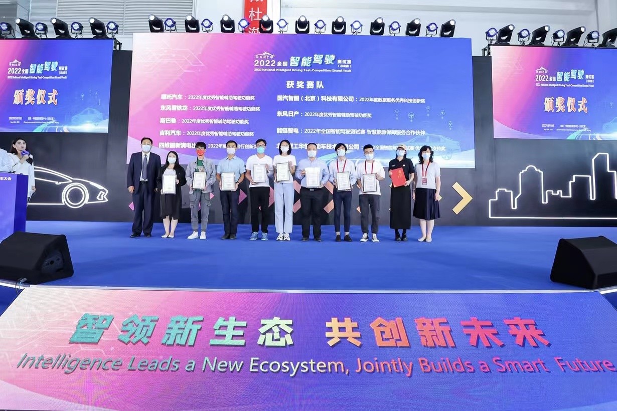 9月19日上午,在2022世界智能網(wǎng)聯(lián)汽車大會(huì)閉幕式上,舉行了2022全國(guó)智能駕駛測(cè)試賽頒獎(jiǎng)儀式,向優(yōu)勝者車隊(duì)頒發(fā)獎(jiǎng)金和證書。